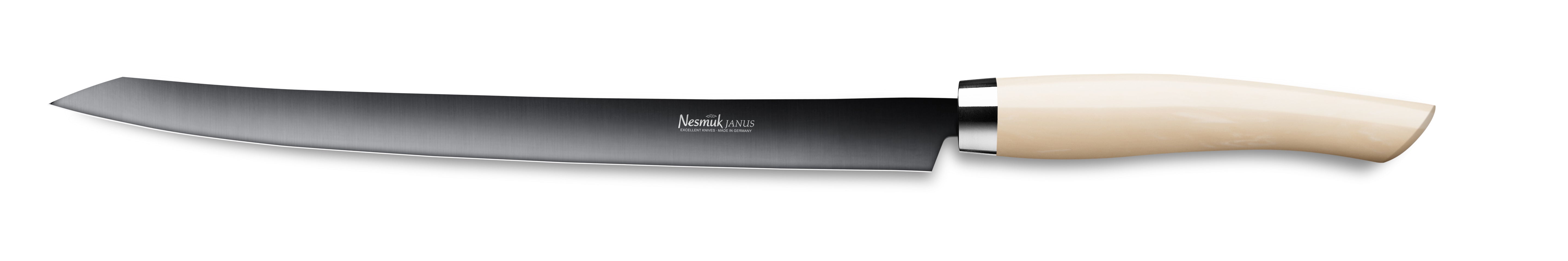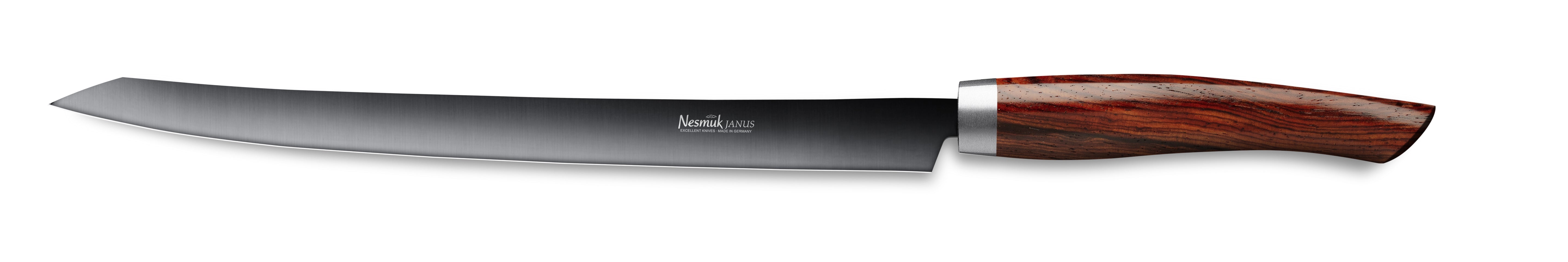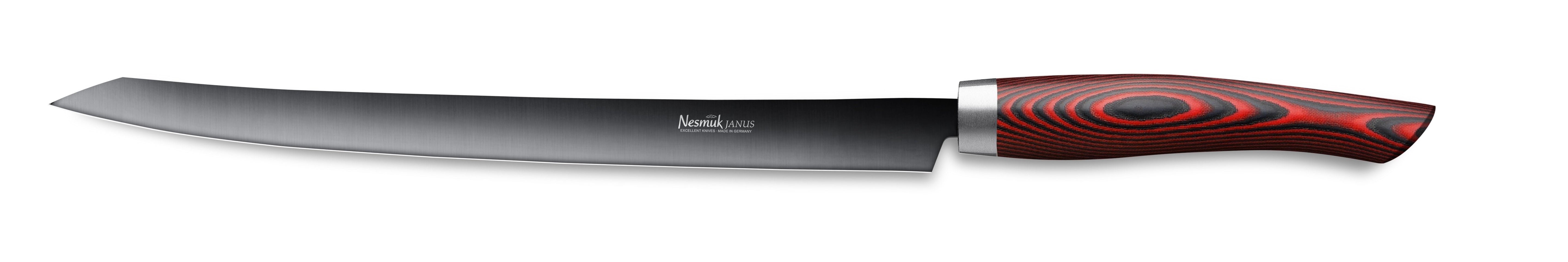 Filetiermesser sind die Go-to-Messer wenn Sie Fleisch oder Fisch filetieren möchten. Je nach Einsatzgebiet können Sie zwischen einseitig und beidseitig geschliffenen bzw. starren und flexiblen Messern wählen. Vor allem in der japanischen Küche, im Speziellen beim Sashimi schneiden, wird Fisch mit einseitig geschliffenen, starren Messern namens Yanagiba zubereitet. Für alle anderen Schnitte empfiehlt sich ein beidseitig geschliffenes Filetiermesser. Optimalerweise sollte das Nahrungsmittel in einem Zug durchtrennt werden. Deshalb: Je größer das Stück Fleisch desto länger sollte auch das Messer sein. In den meisten Fällen reichen 23cm aus. Für das bloße Zerschneiden von Fleisch oder Fisch bietet sich ein starres Filetiermesser an, wenn man aber am Knochen arbeiten ein flexibles, weil sich dieses bei Druck nicht so leicht im Knochen verkantet.