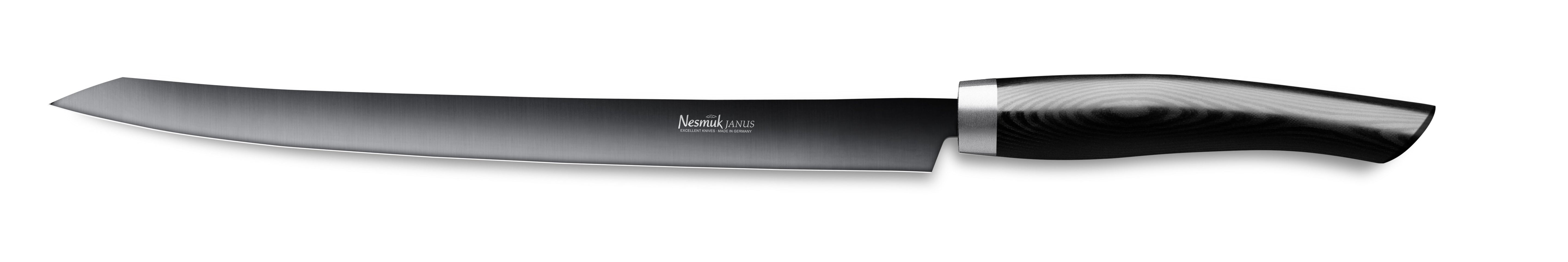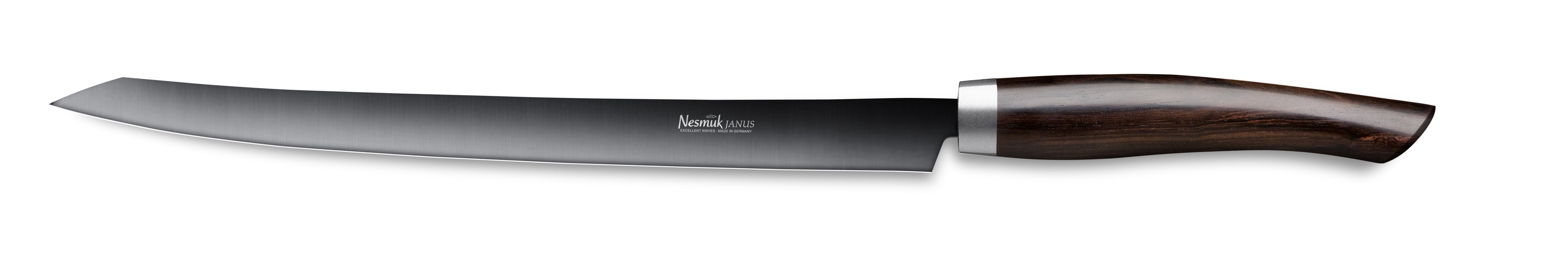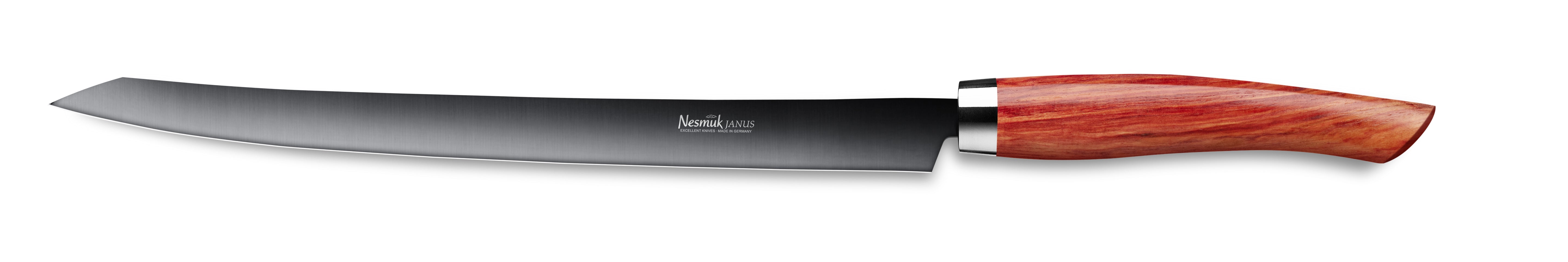 Filetiermesser sind die Go-to-Messer wenn Sie Fleisch oder Fisch filetieren möchten. Je nach Einsatzgebiet können Sie zwischen einseitig und beidseitig geschliffenen bzw. starren und flexiblen Messern wählen. Vor allem in der japanischen Küche, im Speziellen beim Sashimi schneiden, wird Fisch mit einseitig geschliffenen, starren Messern namens Yanagiba zubereitet. Für alle anderen Schnitte empfiehlt sich ein beidseitig geschliffenes Filetiermesser. Optimalerweise sollte das Nahrungsmittel in einem Zug durchtrennt werden. Deshalb: Je größer das Stück Fleisch desto länger sollte auch das Messer sein. In den meisten Fällen reichen 23cm aus. Für das bloße Zerschneiden von Fleisch oder Fisch bietet sich ein starres Filetiermesser an, wenn man aber am Knochen arbeiten ein flexibles, weil sich dieses bei Druck nicht so leicht im Knochen verkantet.