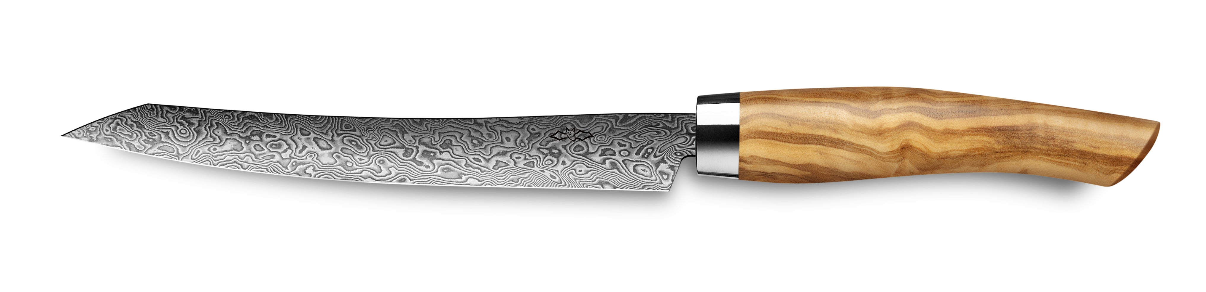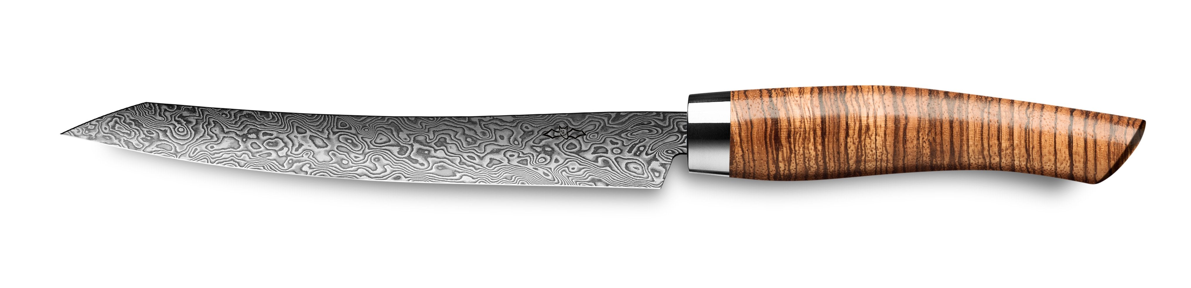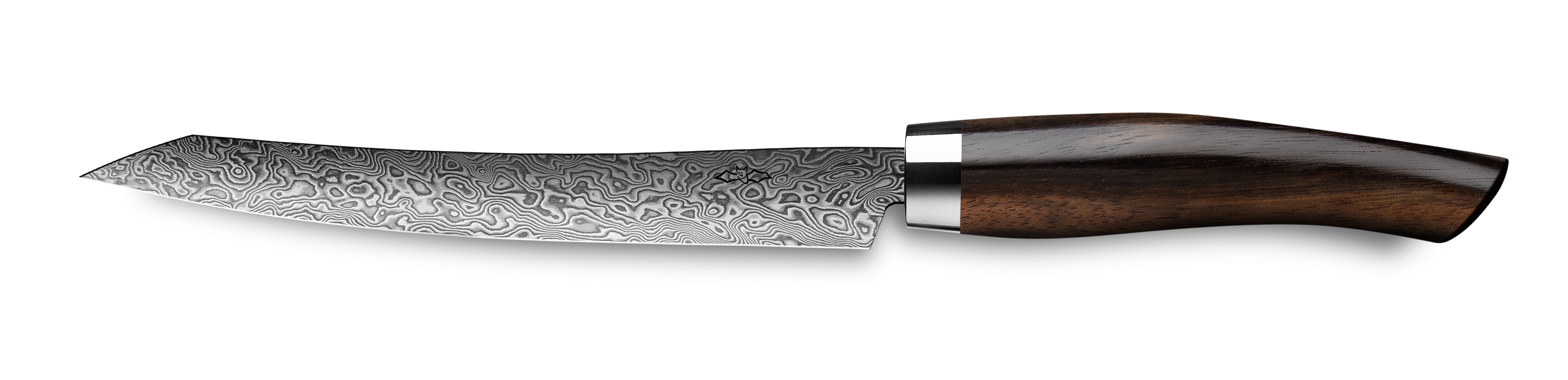 Die Kochmesser-Serie Exklusiv Damast C90 vom deutschsprachigen Hersteller Nesmuk, aus Solingen vereint Eleganz und herausragende Schärfe. Einzigartig am Küchenmessermarkt ist die auf die Klingen aufgebrachte hauchdünne Siliziumschicht namens Nesmuk Protective Coating welche die aus nicht rosfreiem Stahl geschmiedete Klinge konserviert und vor Rost schützt. Die Schneide ist ungeschützt und muss nach Gebraucht mit Kamelienöl benetzt werden. Die 210 lagige Damastklinge wird von Hand geschmiedet und weist eine Härte von 62 HRC und aufgrund dessen auch eine hohe Schnitthaltigkeit auf. Der hochwertige Stahlverbund erlaubt es die Klinge sehr dünn auszuschleifen und resultiert in einer sehr feinen Schneidkante, die das Schneiden zu einem echten Erlebnis macht. Eine Eigenschaft, die diese Serie mit den Janus und Soul Kochmessern teilt, ist die einseitig hohlgeschliffene Klinge. Die formschönen, ergonomischen Griffe aus Edelhölzern oder hochwertigen, synthetischen Griffmaterialien möchte man so schnell nicht aus der Hand legen und tragen zum exklusiven Charakter dieser Messer bei.