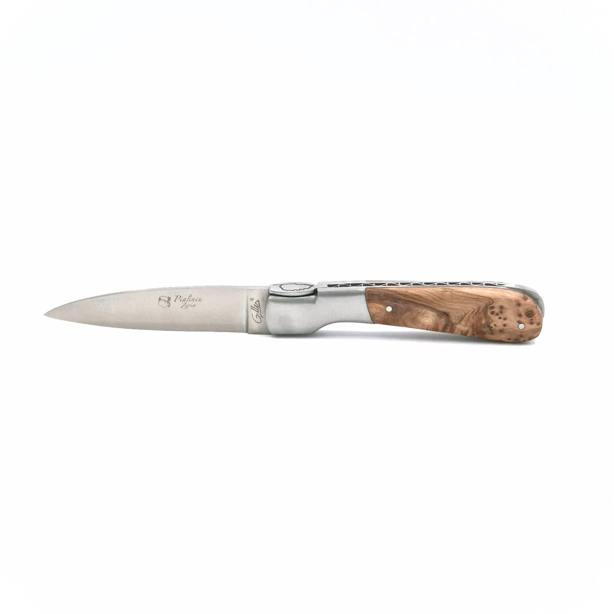 Das 10,5 cm lange Messer „Pialincu” – im südkorsischen Dialekt „Bauer” – wurde gemeinsam mit Antoine Zuria und Robert Beillonnet (1997 und 2000 als bester französischer Messerschmied ausgezeichnet) entwickelt. Es ist eine Weiterentwicklung des 12 cm langen Sperone Zuria & Gilles® in kleinerer Ausführung. Das Pialincu-Messer verfügt über einen Präzisionsmechanismus mit einer sicheren Klingenarretierung und einem soliden Klingenanschlag, um eine lang anhaltende Schärfe zu gewährleisten.